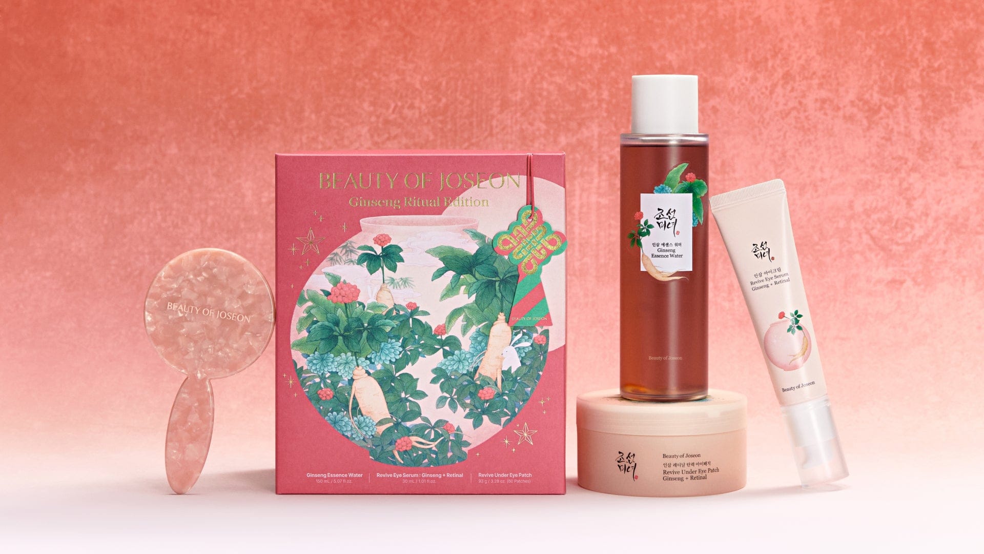 Our limited-edition ginseng skincare set is made for the person who treats skincare like a ritual, not a routine. This trio of luxurious essentials is infused with nutrient-rich ginseng to firm, plum, and nourish skin. We decorated our Ginseng Essence Water, Revive Eye Serum, and Revive Under Eye Patch with heritage illustrations inspired by the timeless elegance of Hanbang, then added a mother-of-pearl hand mirror for a royal touch. If you’re short on time, definitely grab this one. It comes boxed up and ready to gift.